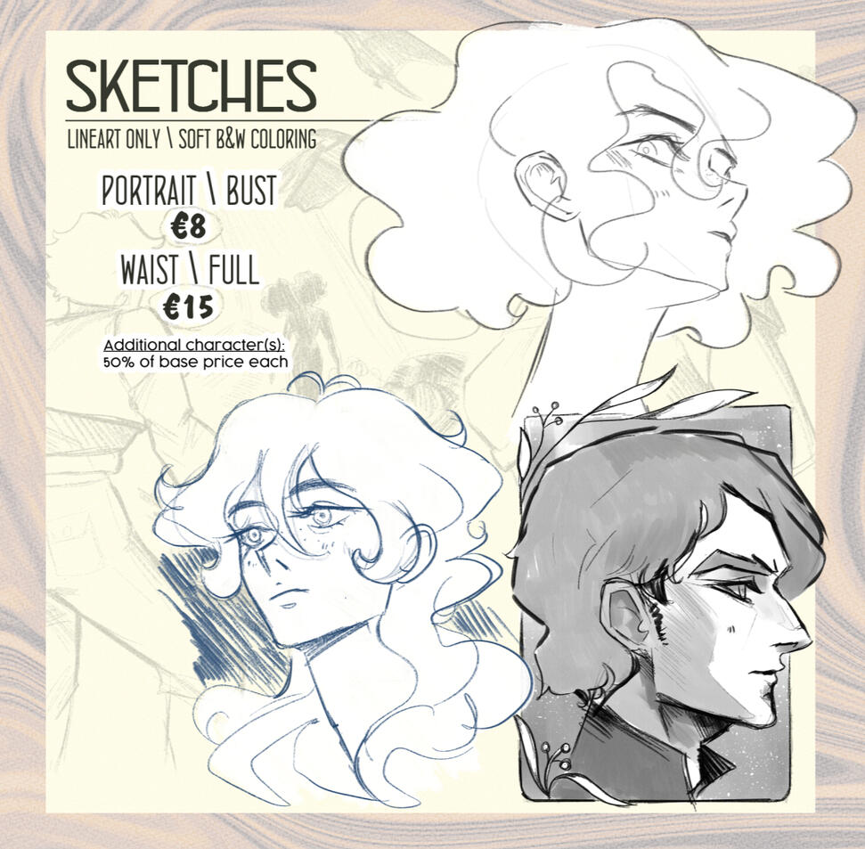 In order to start working on your commission, I need a reference for the character or person you wish me to depict - character sheets and descriptions are welcome! If you have a certain pose in mind, please send me a reference for that as well.
