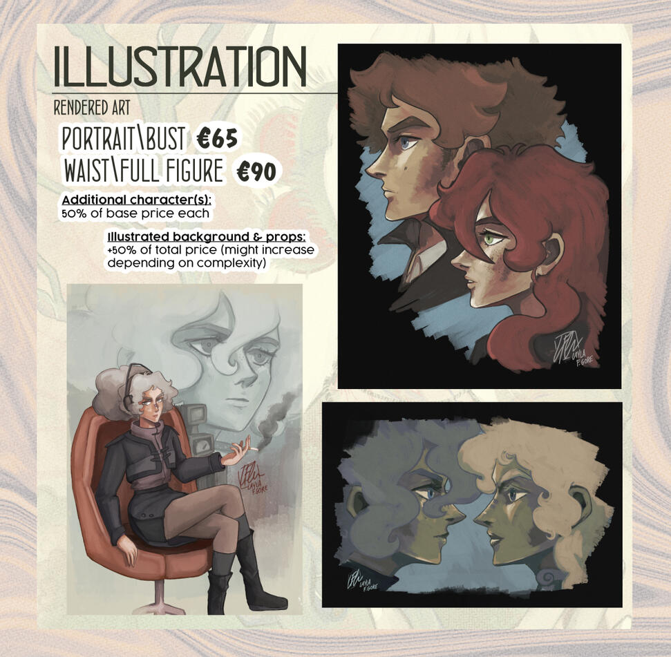 You decide if you prefer a classic digital or watercolor-like coloring style (see examples).Simple backgrounds (flat colors, gradients or brush strokes) are included in the price.This option can also be used as a base for character sheets or to depict multiple poses of the same character.Anything additional (including complex props) will require a price surplus which we can discuss beforehand, depending on complexity.
